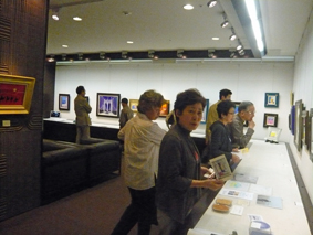 | 画廊はオープンなスペースという事もあり、来場者が熱心に観て下さっています。絵葉書セットを手にされ・・・‘実物にしようか!絵葉書で我慢しようか?‘迷ってマス。 | ‘三つ子の魂!百 まで‘ のことわざを実証してくれる様な天才少年が画廊に登場! ‘どの絵にもパーポー(紫)があるヨ!‘ いきいき、ハキハキ!輝いた目に修太先生も楽しくタジタジ☆ |